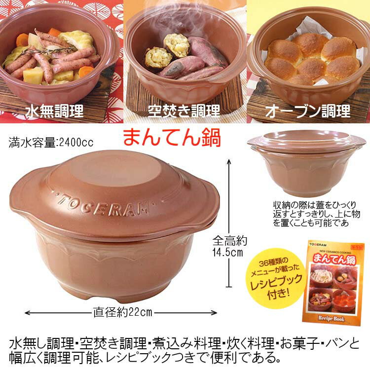 サイズ:取っ手を含む径約22cm×全高約14.5cm、満水容量:2400cc、日本製、 トーセラム耐熱陶製調理器具鍋の裏底温度は、弱火の状態でも300℃に達します。