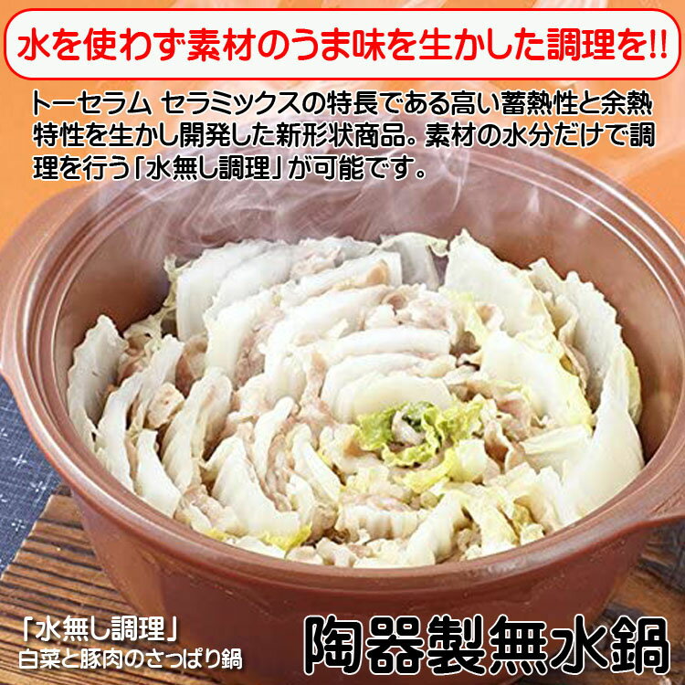 陶器製無水鍋 素材の水分だけで調理を行う「水無し調理」が可能です。